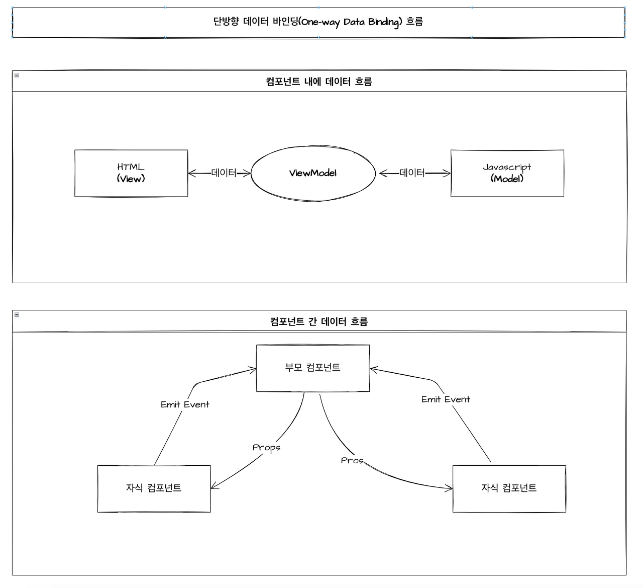 컴포넌트 내에서 '단방향 데이터 바인딩'은 Javascript(Model)에서 HTML(View)로 한 방향으로만 데이터를 동기화하는 것을 의미